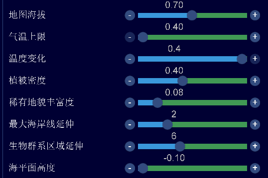 - 海平面决定海域面积,开小有助于减少海奢种类并增大铺城空间
