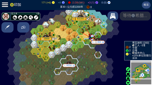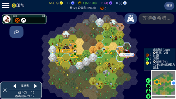 此外,随着城市人口的增加,增长所需的食物也越来越多。这导致在早期战争阶段,通常当主城人口达到 6 人、分城人口达到 4 或 5 人时,玩家就需要转变策略,将重心转向提高产能。因为继续增加人口所需的食物成本太高,与纯产能收益不成正比。